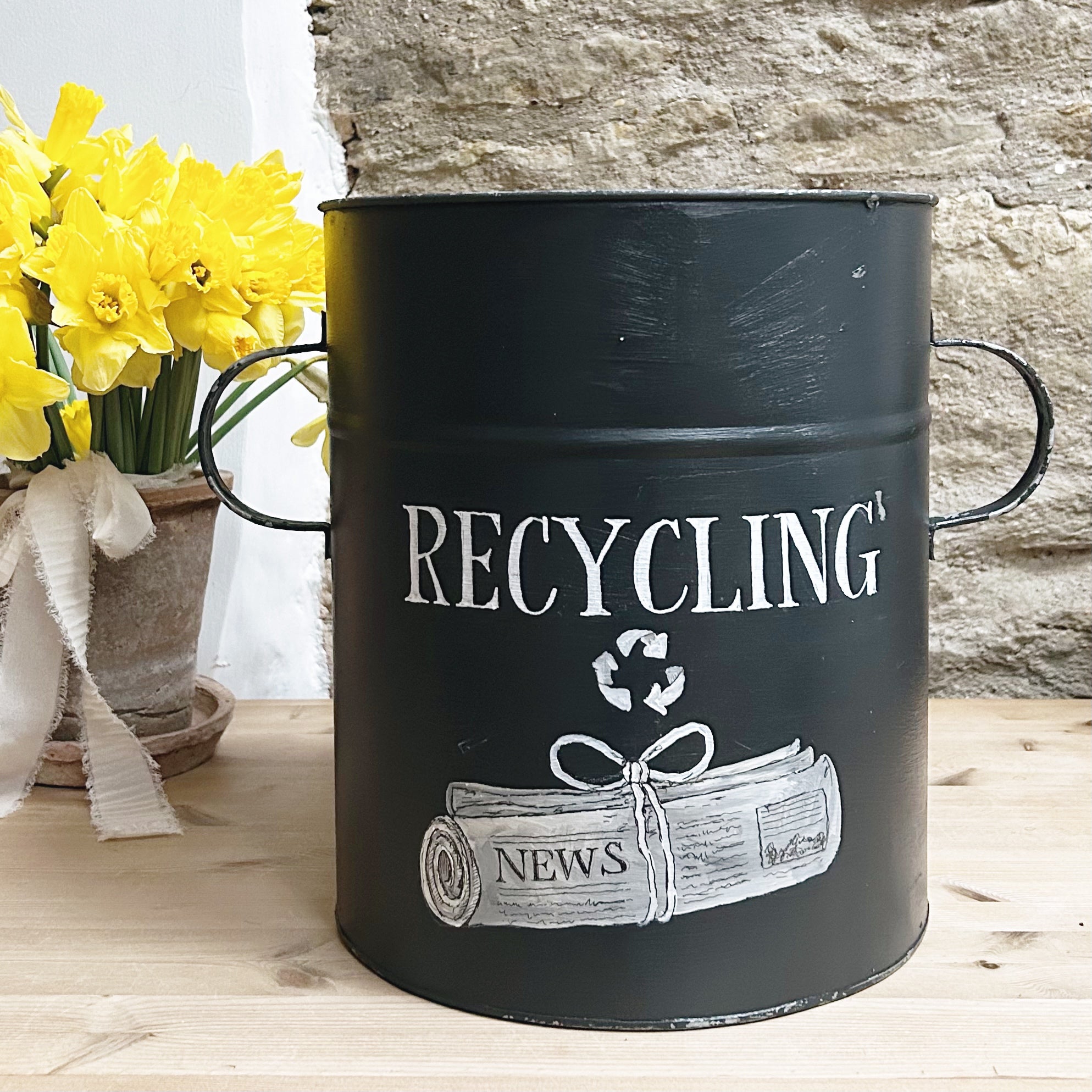 Keep everyday essentials beautifully organised with this hand-painted Goose & Grey recycling tub. Made from lightweight metal and finished in a classic charcoal with a chippy finish, it features our characterful hand-painted lettering and a charming newspaper illustration, giving a simple household item a thoughtful, vintage-inspired feel.