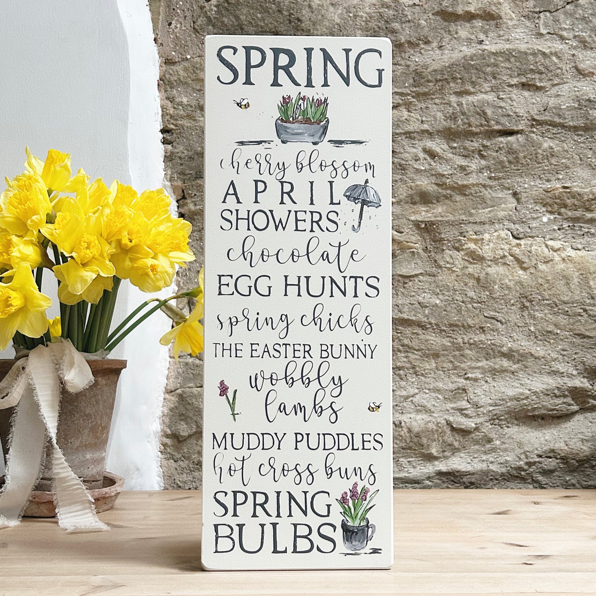 Step into spring with this gorgeous handmade Goose & Grey board, filled with gentle springtime words and finished with our hand-painted illustrations. A charming tub of tulips, a little umbrella and a pot of fresh blooms sit beautifully amongst the lettering, adding layers of colour and detail that perfectly complement the words.
