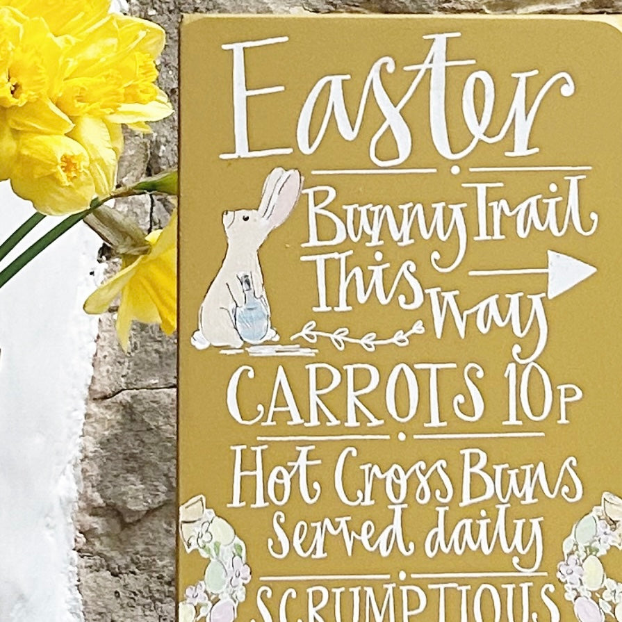 Painted in soft, calming mustard tones, the board is finished with delicate hand-painted illustrations, including a sweet Easter bunny, floral garlands, pastel eggs and a little pot of spring bulbs, bringing warmth and character to the piece.